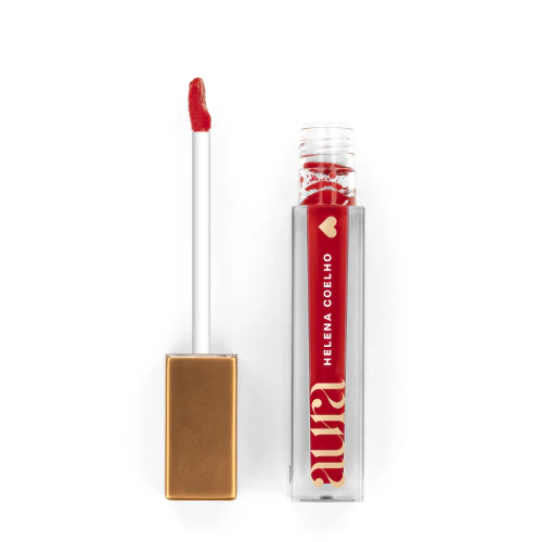 Batom líquido vermelho Aura Helena Coelho com aplicador e embalagem transparente e dourada